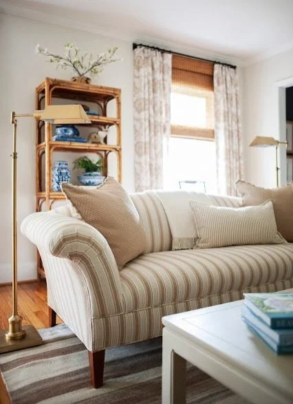 This beautiful living room checks every coastal grandma box: classic look, neutral palette, natural light, great collected pieces. The splashes of blue are lovely.