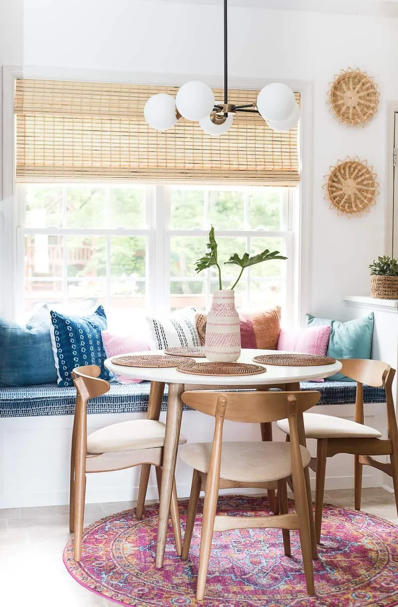 The combination of gorgeous textiles, wood tones, and natural light place this breakfast nook firmly in coastal grandmother territory. The baskets on the wall definitely seal the deal.