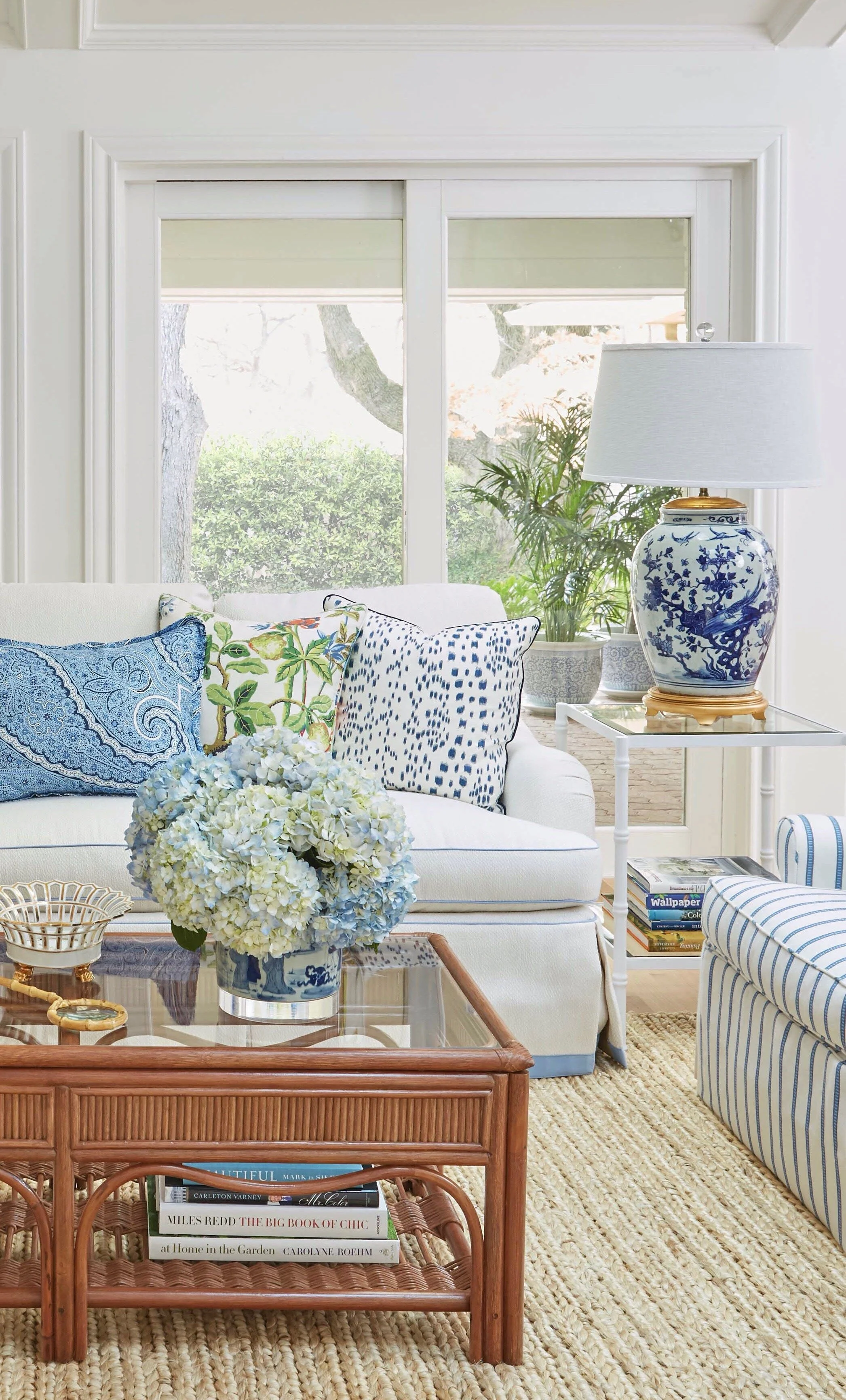 The textiles, rug, and coffee table in this family room are so great and very coastal grandma. It feels traditional but fresh, and the natural light is the cherry on top.