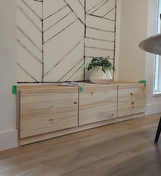 In order to make the Billy Bookcases not look like standalone bookcases, Steph cut the toekick section off the bottom of each one.