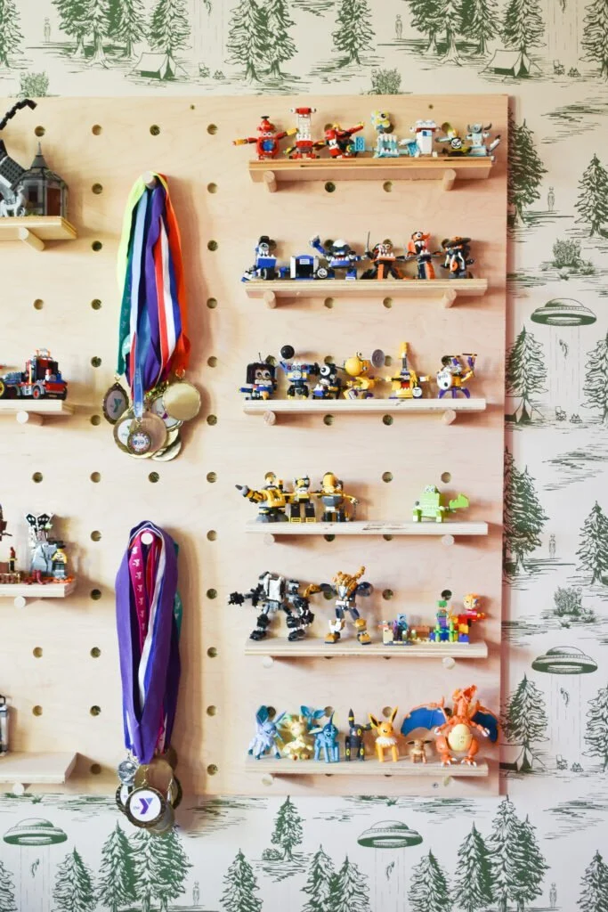 A pegboard is a great balance of form and function. The pegboard pictured above, made by Lindsey of Hilltown House, covers so much wall space, looks fantastic and fun, and also gives her a way to store her sons’ action figures.