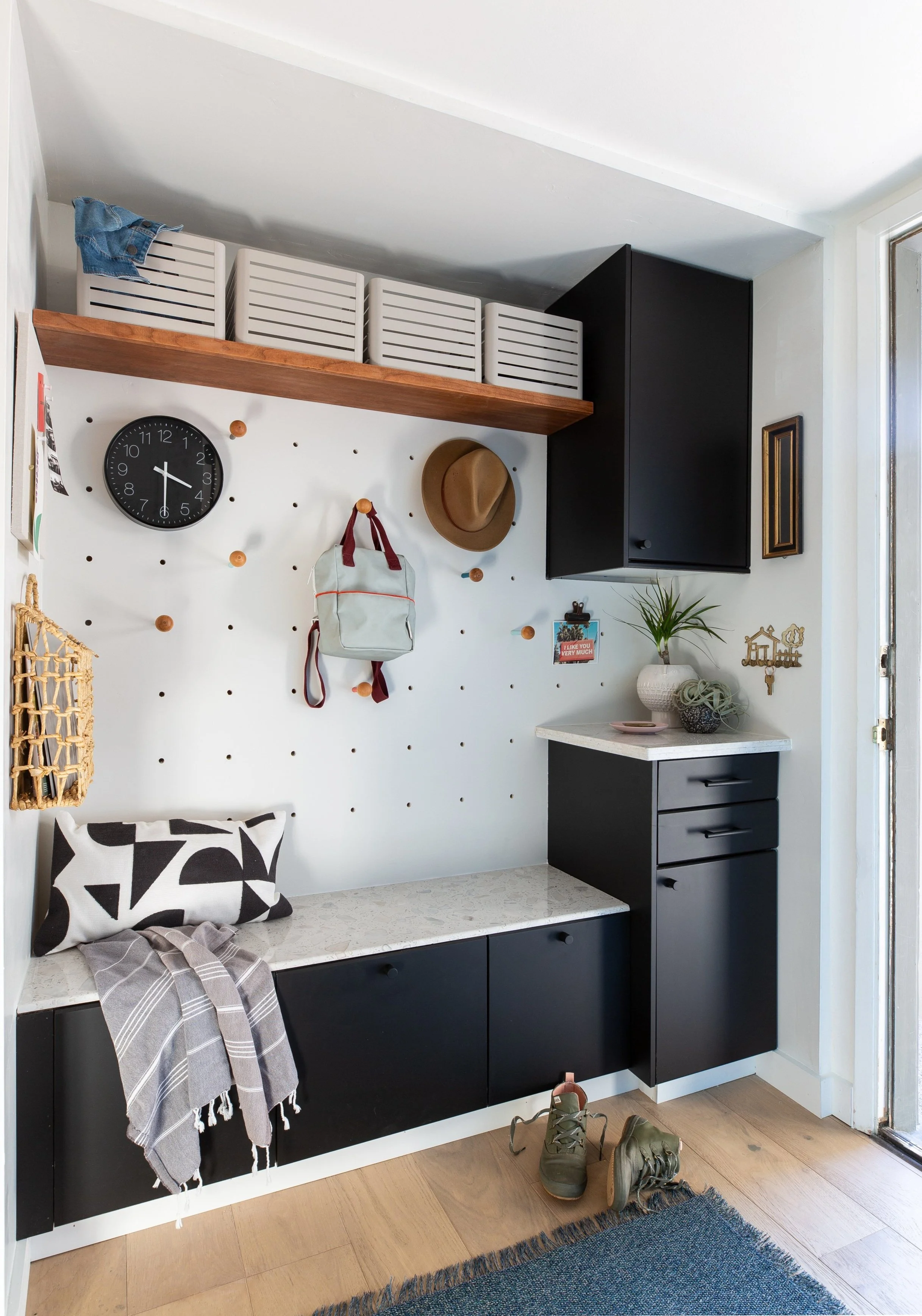 Here’s another example of a pegboard being stylish and functional. This is a large custom pegboard made by Rebecca of Studio Plumb for her mudroom. It’s incredibly cute, and it reduces clutter in an incredibly efficient way!