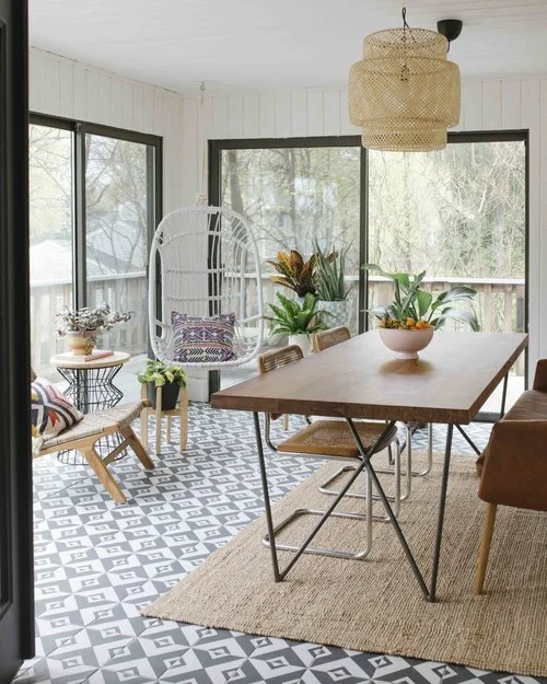 Hanging chairs are incredibly versatile and can suit any space depending on what is paired with it. Megan of Less House More Home’s living room is modern eclectic with a moody, natural vibe. The hanging chair feels fun, but still fits into her space, especially with the high contrast, black and white blanket and pillow she paired with it.