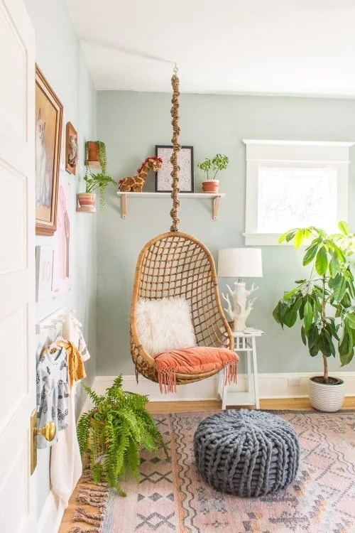 Hanging chairs date all the way back to 1957; the original hanging egg chair was designed by Nanna Ditzel to reduce the number of furniture legs cluttering a space visually while still being aesthetically pleasing. Given the huge revival of mid-century modern styles in the past couple of decades, it makes sense that hanging chairs have been having a bit of a moment recently. They’re whimsical, space-efficient, and versatile. If you’re looking to add a splash of playfulness to your room, check out these One Room Challenge projects for hanging chair inspiration.
