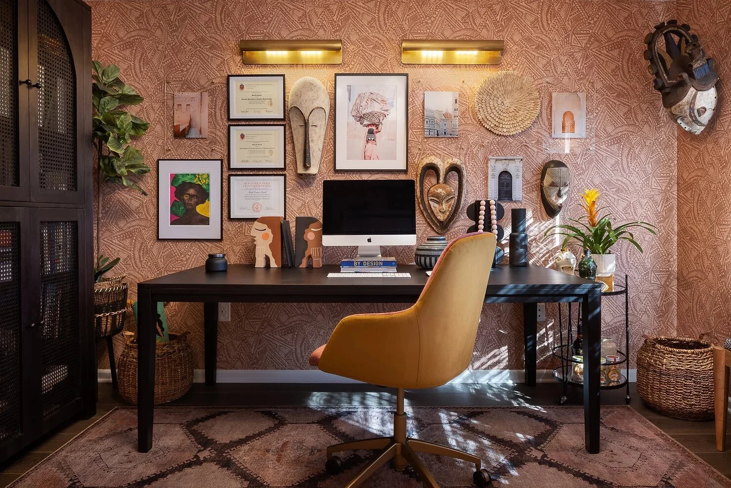 If you’re still in need of more gallery wall inspiration, check out this one, also by Beth Diana Smith, from the fall ‘21 ORC. It’s a real “well, she’s done it again” moment. Since the wallpaper is already so intricate, she went with mostly softer colors and natural materials that wouldn’t conflict.