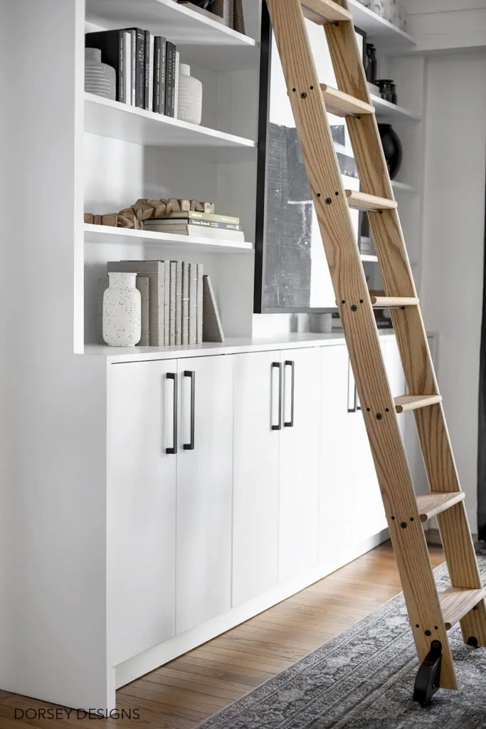 An IKEA hack for the ambitious and power-tool-inclined is creating an amazing built-in piece using IKEA cabinets and shelves. This absolutely stunning built-in cabinet system is by Rebecca of Studio Plumb from her dining room ORC project. It’s comprised of two short Billy bookcases, two Sektion upper kitchen cabinets, and one smaller Sektion in the middle. The Billys are hung upside down so trim could be added above to give it that amazing built-in look. All the IKEA pieces in total cost around $500, which is significantly less than hiring a carpenter to create something custom.