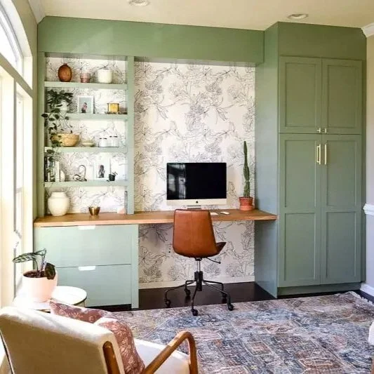 This gorgeous green IKEA hack built in is by Sarah & TJ of Making Joy and Pretty Things from their office ORC project. The desk is made from an IKEA filing cabinet, which they removed the top and replaced with a butcher block filing cabinet. On the righthand side, they used IKEA Sektion pantry cabinets, which was a genius move because they add so much storage space.