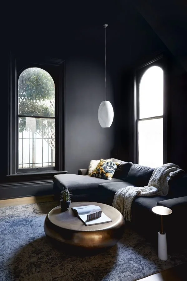 In this ultra moody, gorgeous living area, Erin of Apartment 34 painted the walls and ceiling a matching matte dark gray. It gives the space so much drama and flair, and also makes it feel so intimate. It especially works in this space due to the high ceiling and high windows balancing the dark paint.
