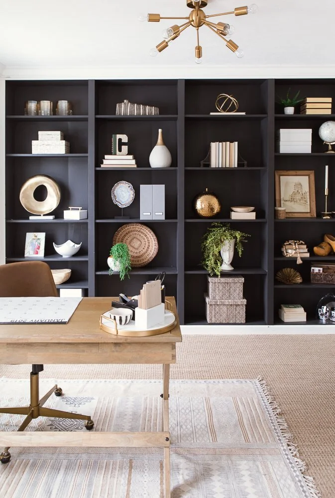 This organic and chic office seems like such a calming space to work. The sisal rug really ties the space together and is a lovely contrast with the dark shelves.