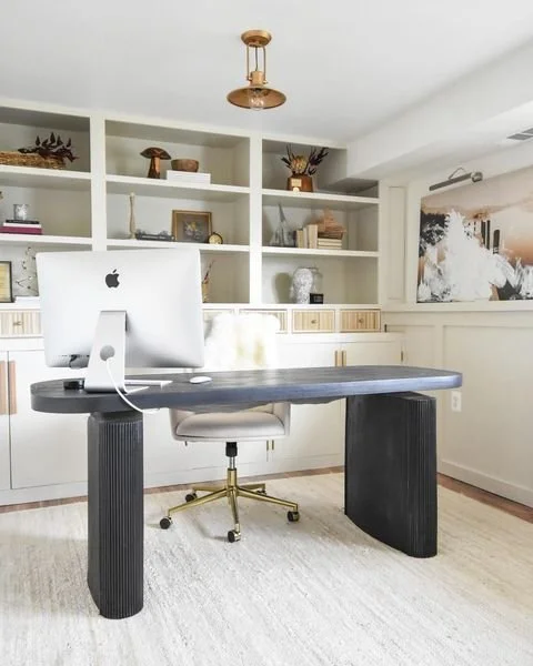 If you’re someone who loves a sleek, clean, and minimal workspace, you can still make it feel warm and alive by bringing in a few natural elements. The natural wood fluted drawers are such a wonderful detail in this space.