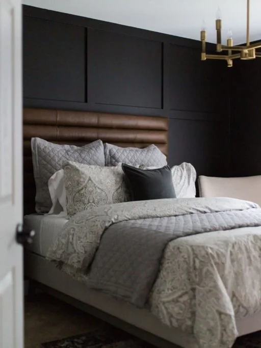 A beautiful leather headboard was the perfect mid-tone between the dark wall color with the light bedding.