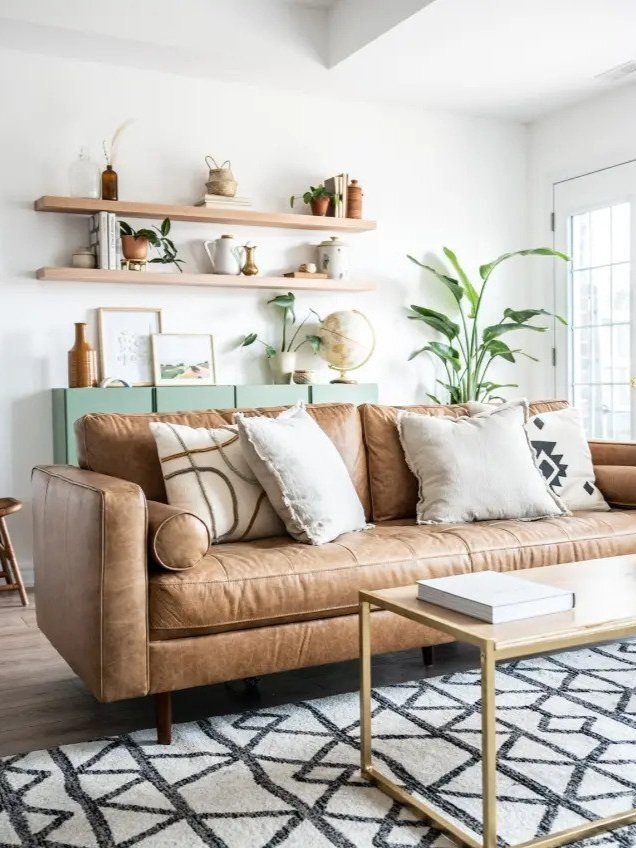 On the other side of the spectrum, here is a gorgeous leather sofa bringing a touch of ruggedness into a more bright, feminine space.