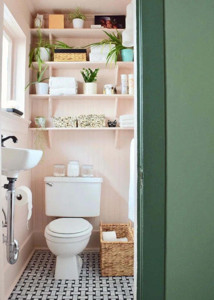 This gorgeous pale pink paint is the perfect complement to that green. It’s subtle enough to not fight with the green, but it still feels full of life. It makes the powder room glow!