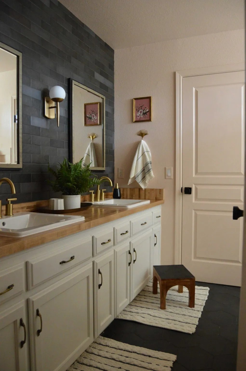 The paint in this girls’ bathroom is very toned-down, but it has just enough color to make the space feel youthful and warm.