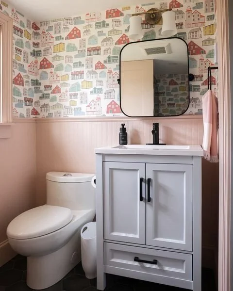 In this powder room, the pale pink paint perfectly matches how lively and happy the wallpaper is, while still providing a nice neutral tone to balance the space.