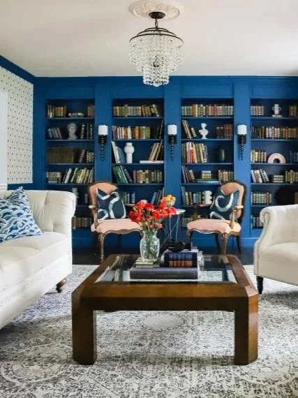 This burled wood coffee table, as well as the very traditional wooden chairs behind it, help to balance the playful, saturated blue paint on the bookshelves by bringing a more serious vibe into the space.