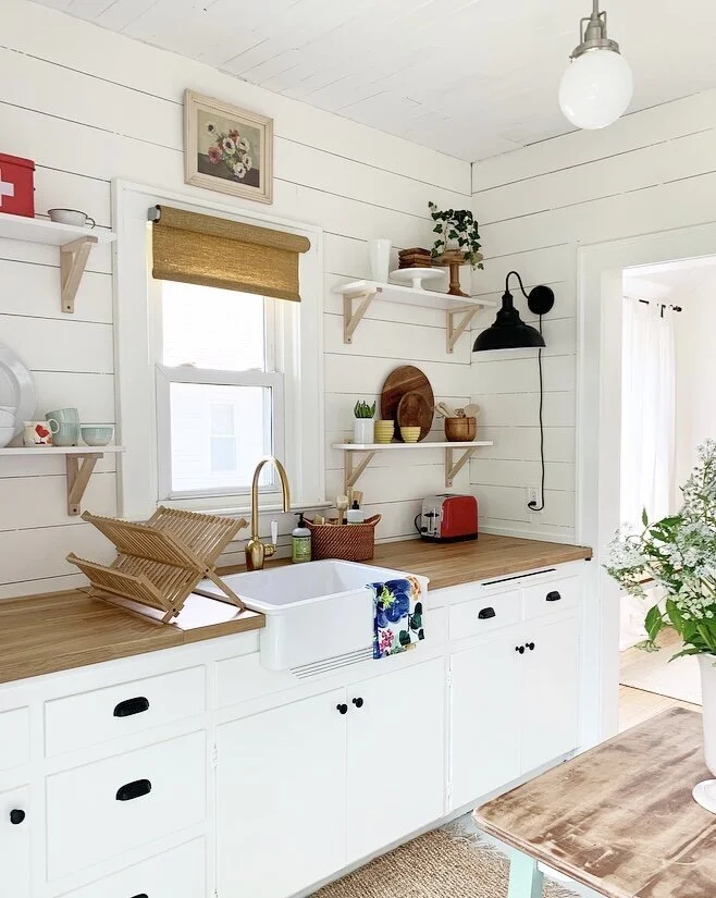 A wood butcher block countertop pairs perfectly with white kitchen cabinets, and the shiplap walls are really the cherry on top. This kitchen feels so charming and full of character.