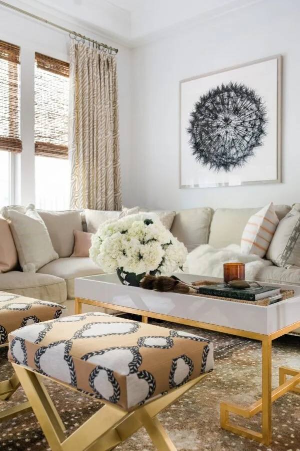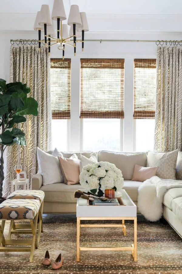 This stunning neutral palate was created by Mandy, from Waiting on Martha. Featuring gorgeous Stroheim fabric, Antelope rug from Karastan, and a Jonathan Adler Chandelier.